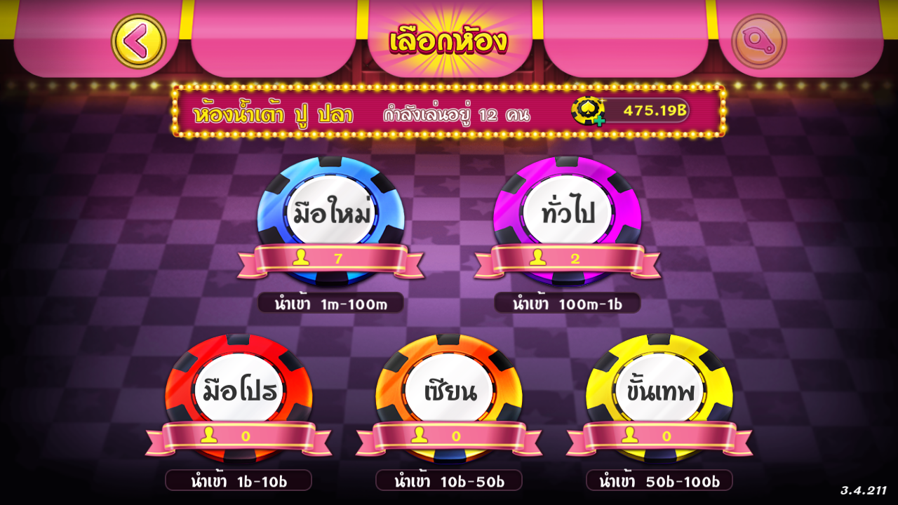 1.เข้าเกม  กด น้ำเต้าปูปลา หรือกดสัญลักษณ์  [:::]  เพื่อเลือกประเภทห้องการเดิมพัน